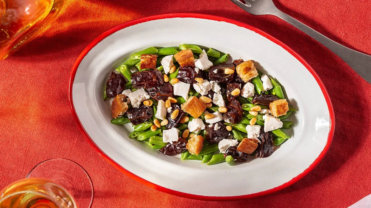 Las judías verdes están en su fecha óptima de consumo, así que si solo se te ocurre preparar la clásica ensalada con patata y zanahoria, en esta receta te damos una versión que combina el dulce del dátil y el sabor del queso de cabra.