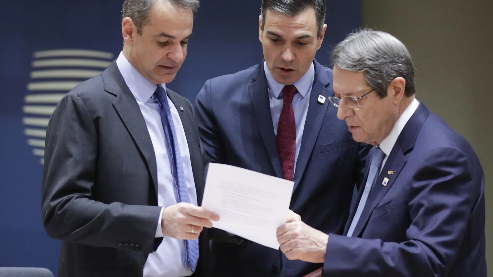 En las imágenes de los prolegómenos de la cumbre se vio a Sánchez conversar con los primeros ministros de Grecia y Chipre, Kyriakos Mitsotakis y Nicos Anastasiades, respectivamente, mientras leían un documento.