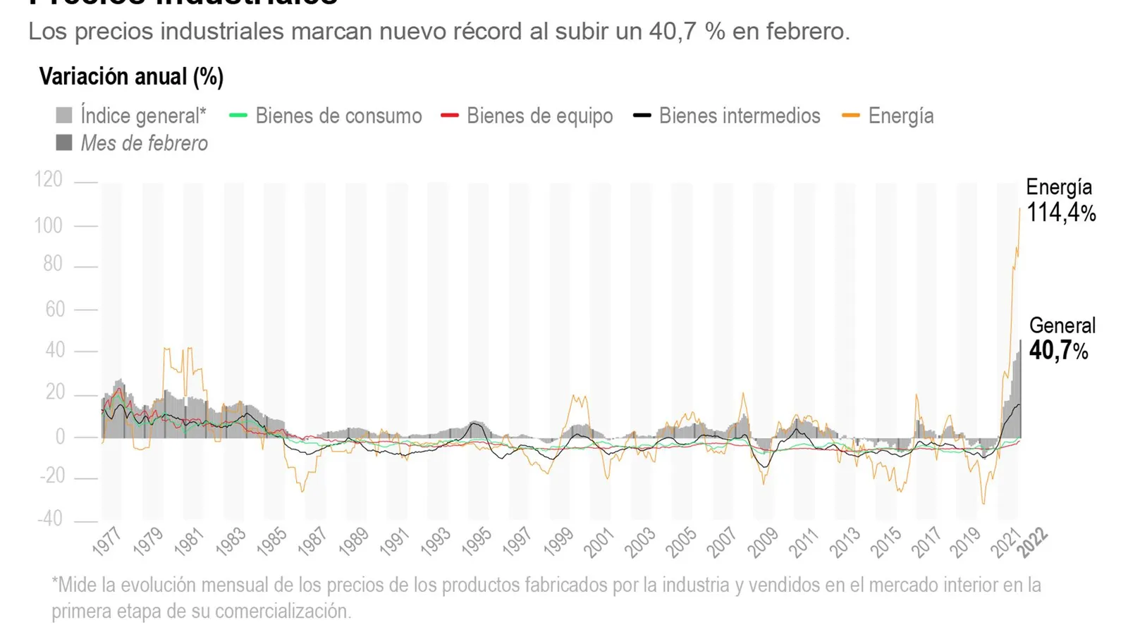 De acuerdo a los datos del Índice de Producción Industrial (IPRI) publicado este viernes por el Instituto Nacional de Estadística (INE), la subida de precios industriales de febrero -la quinta consecutiva por encima del 30 %- es la mayor de la serie histórica que arranca en 1976.