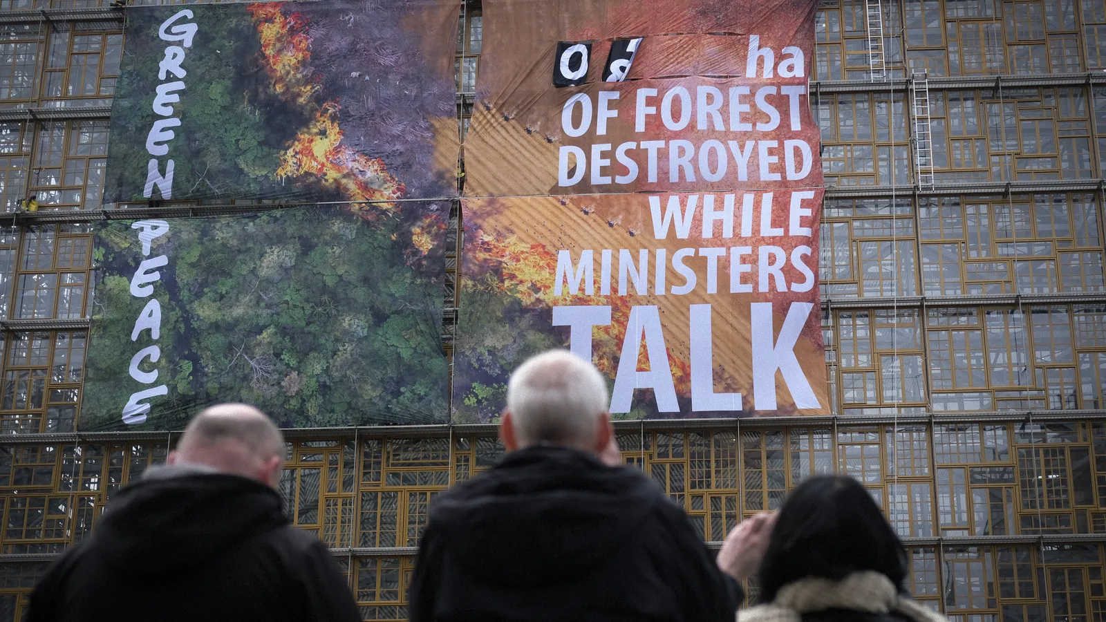 Precisamente, en la acción de Greenpeace, una vez desplegaron todas las lonas en la fachada de la sede del Consejo de la UE, los mismos escaladores empezaron a cambiar manualmente la cifra de hectáreas de bosque quemadas cada dos segundos, a fin de lograr un marcador a tiempo real de la deforestación en el mundo.